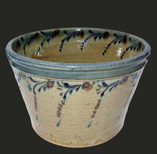 Grès cuit à 1300° - Décor aux engobes (fer, cobalt et porcelaine) à la poire sur terre crue. Email à base de cendres de sarments.