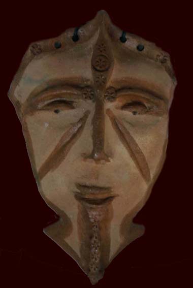 Masque en argile rouge cuit en "meule"(feu ouvert) . Certaines parties du masque sont patinées à la résine.