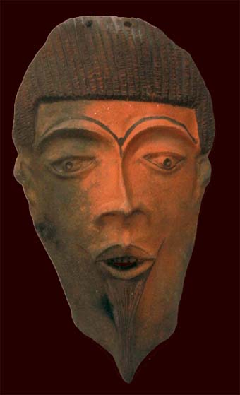 Masque en argile rouge cuit en "meule"(feu ouvert) . Certaines parties du masque sont engobées en noir